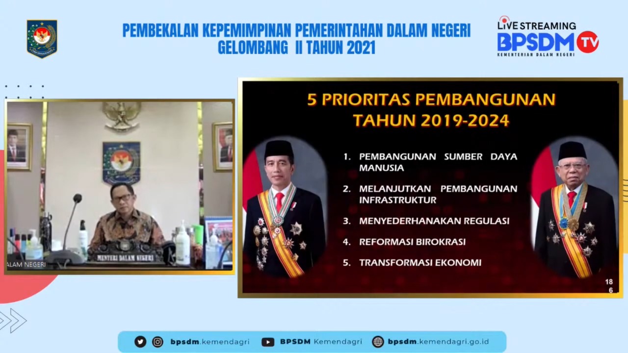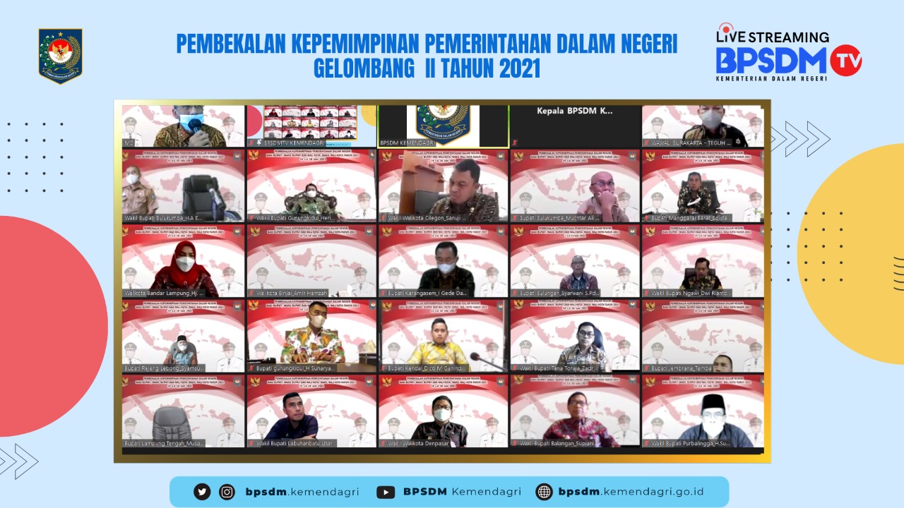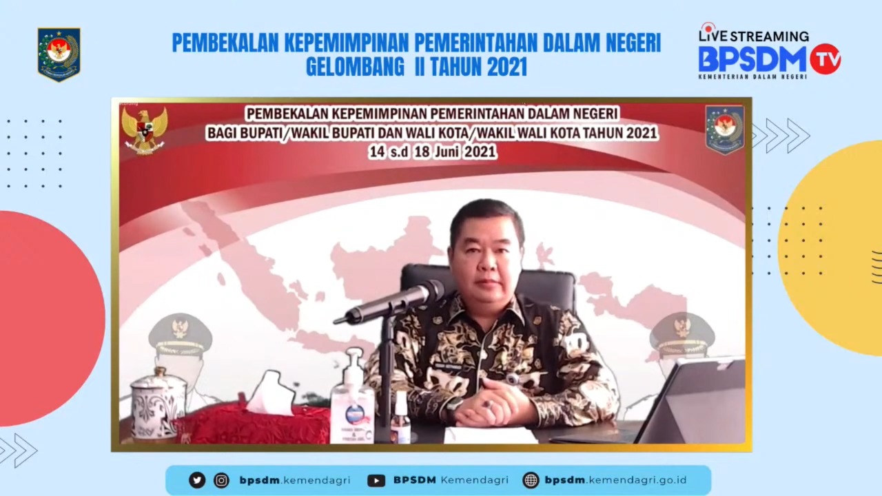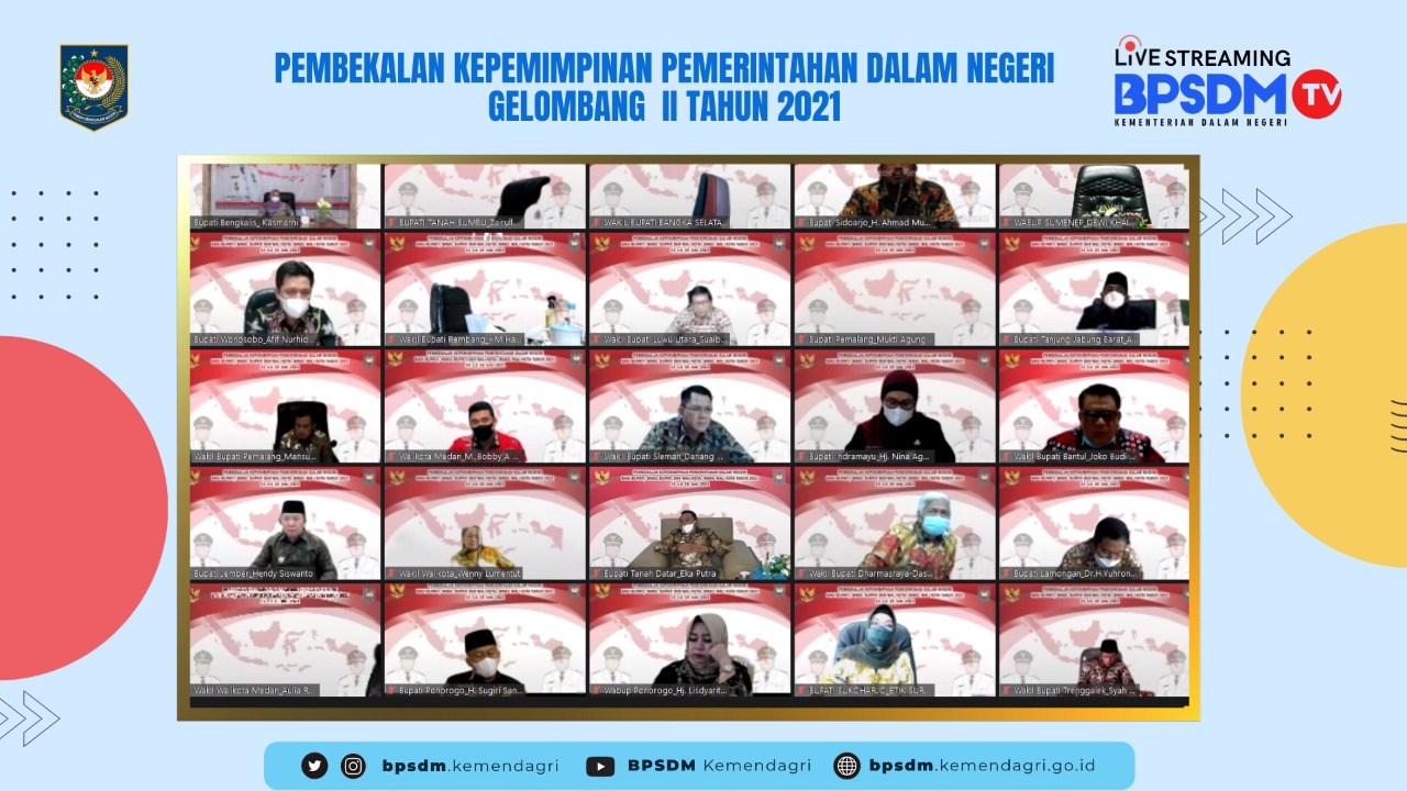 Jakarta – Selasa (15/6/21) Kementerian Dalam Negeri (Kemendagri) melalui Badan Pengembangan Sumber Daya Manusia (BPSDM) c.q. Pusat Pengembangan Kompetensi Pemerintahan Dalam Negeri menyelenggarakan kegiatan Pembekalan Kepemimpinan Pemerintahan Dalam Negeri bagi Bupati/Wali kota dan Wakil Bupati/Wakil Wali kota Hasil Pemilihan Kepala Daerah Serentak Tahun 2020.